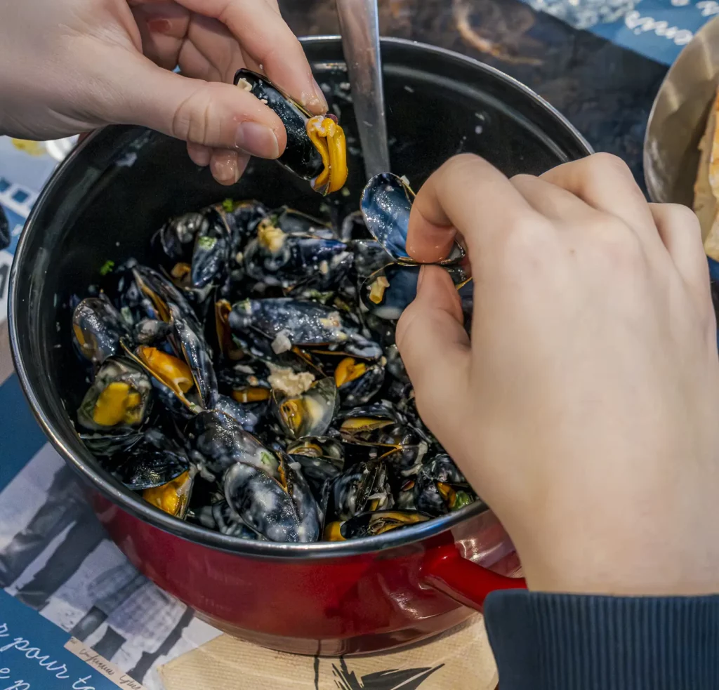 Servies en saison, nos moules proviennent de Dunkerque et nous sont livrées par Romain Laneel. Elles sont au centre de notre plat emblématique : les moules-frites.